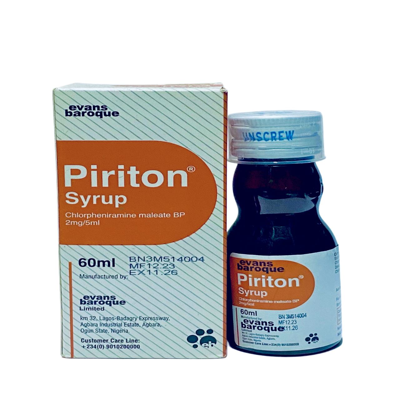 Piriton syrup (60ml) is indicated for the relief of allergic symptoms such as hay fever and urticaria, contraindicated in patients with known hypersensitivity to chlorphenamine or any component of the formulation, may cause side effects like drowsiness, dizziness, and dry mouth, and can interact with alcohol and other central nervous system depressants, potentially enhancing sedative effects.